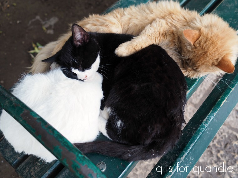 The cats make themselves at home everywhere, including snuggling up for a cat nap on a park bench.