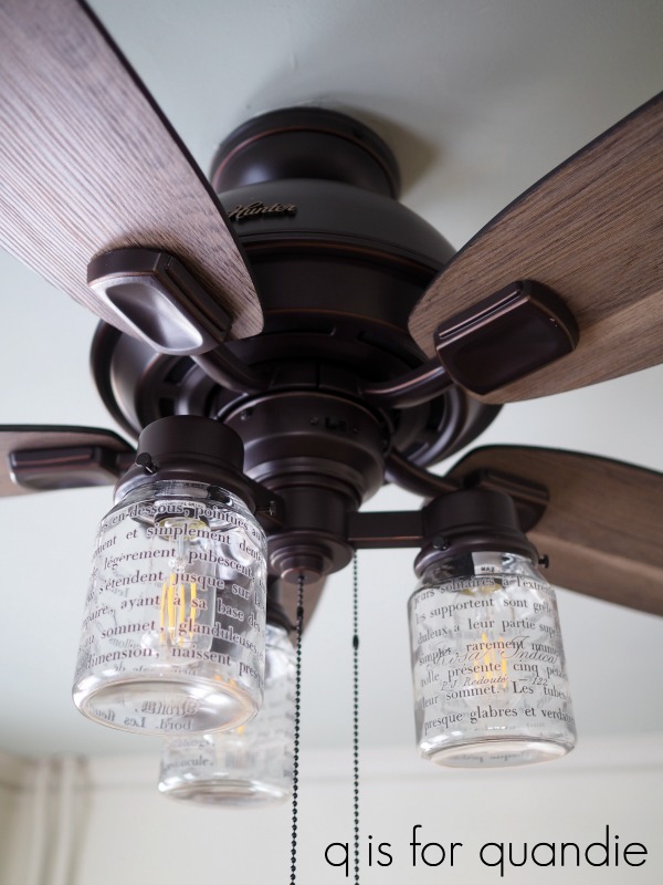 1. Even though we have central air, ours is an open floorplan, and heat rises. We installed a ceiling fan to better distribute the air and are convinced they are the best home improvement project ever. We cringe when watching home improvement shows where the fan is the first thing to go. Really…In Texas?! I love your application of transfers. They are subtle but might help reduce the glare that comes with clear globes. Plus you have marked your new property and made it your own, which is very important!