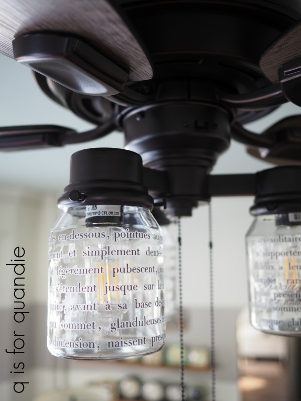4. Well, in Texas you need ceiling fans in every room even with central air! So other than my breakfast and dining room, we have ceiling fans as light fixtures. It’s so difficult to find fans that are not ugly and not overpriced! You found a good one. And made it better. Be interesting to see it at night, does it throw words on the walls!