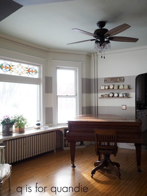 So, we don’t have central a/c and ceiling fans can make all the difference on hot summer days at our house.  Especially in the room that I call the piano room.  This room is right in the center of our lower level.  It’s also the room where we install a window a/c unit in the summer, so we need to move that cool air around and a ceiling fan is the best way to do it.