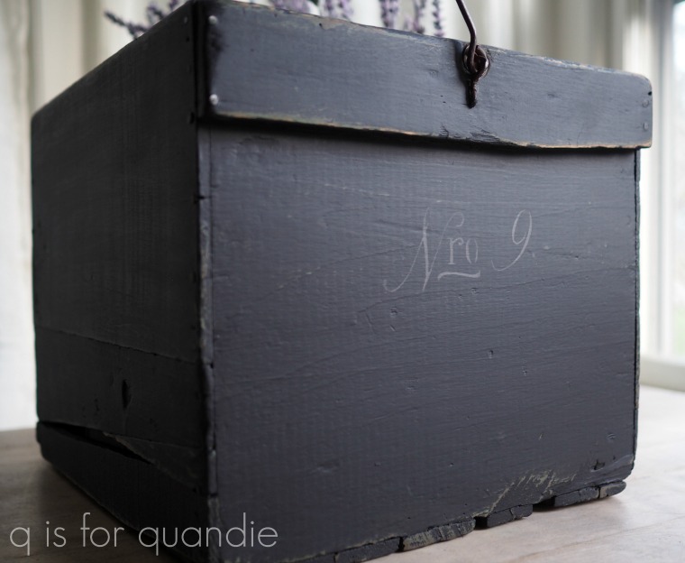 This rustic wooden crate with a handle was $4.   I didn’t love the muddy green color it was painted in, but I knew I could fix that.  And I already have.  I whipped out my Dixie Belle paint in Midnight Sky and quickly painted it.  It only took one coat to cover the green.  I added some stenciling, sanded lightly to distress and finished with black wax.