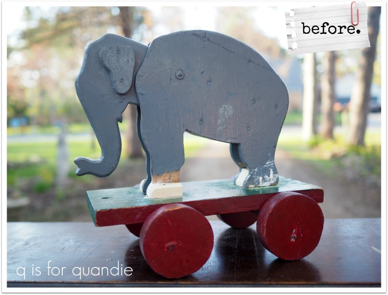I’ve left out the most amazing part of this elephant.  When you pull him along by his string, there is a mechanism attached to the front set of wheels that makes his head go up and down.  Seriously, it is the most stinkin’ adorable thing I’ve ever seen.