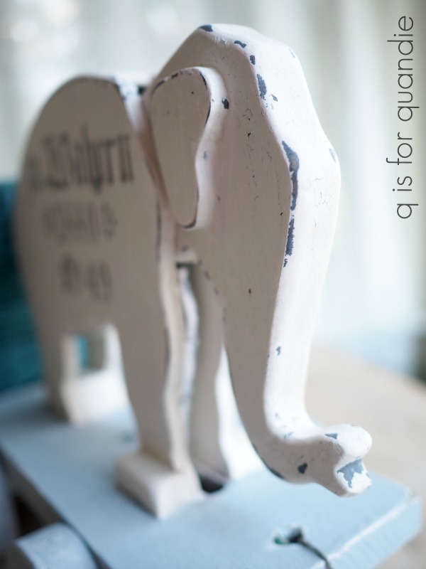 Next I mixed up some of Miss Mustard Seed’s Shutter Grey for the elephant’s cart.  However, after I painted it on I felt like it was too dark.  I wanted to keep the whole look really pale. So I mixed the remainder of my Farmhouse White in with the Shutter Grey to make it a bit lighter.  I’d say this is about a half and half mix.