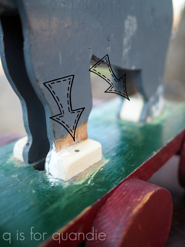 Last week I told you guys that I picked up a set of vintage handmade wooden pull toys at the Byrn Mawr sales.  I only shared the horses and cart because the other pieces had already gone over to Ken’s workshop for some repairs.