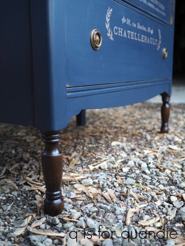 The gold transfer over a dark blue paint color was so striking on her piece, I just had to try it on my dresser too.
