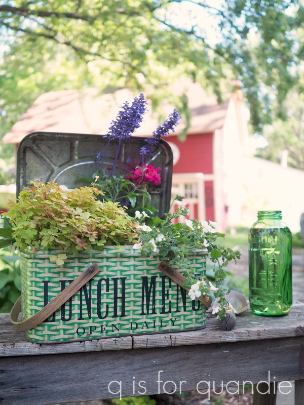 Love both the metal lunch box turned planter and the coffee pot! Charming!