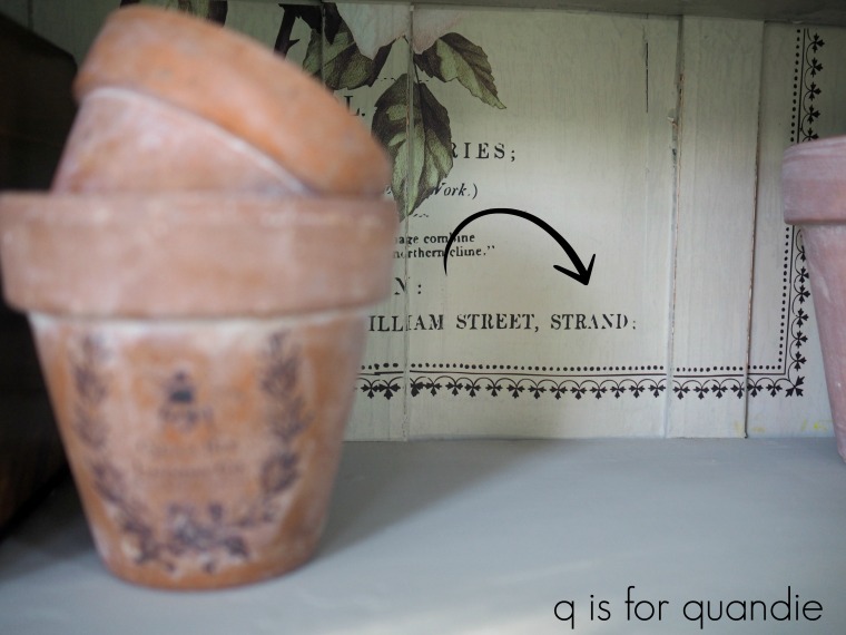 Once I had the transfer in place, I was contemplating what to use to stage the photos of the cupboard.  I wanted something that would work with the botanical theme of the transfer, and then I remembered my clay pots.  Perfect!