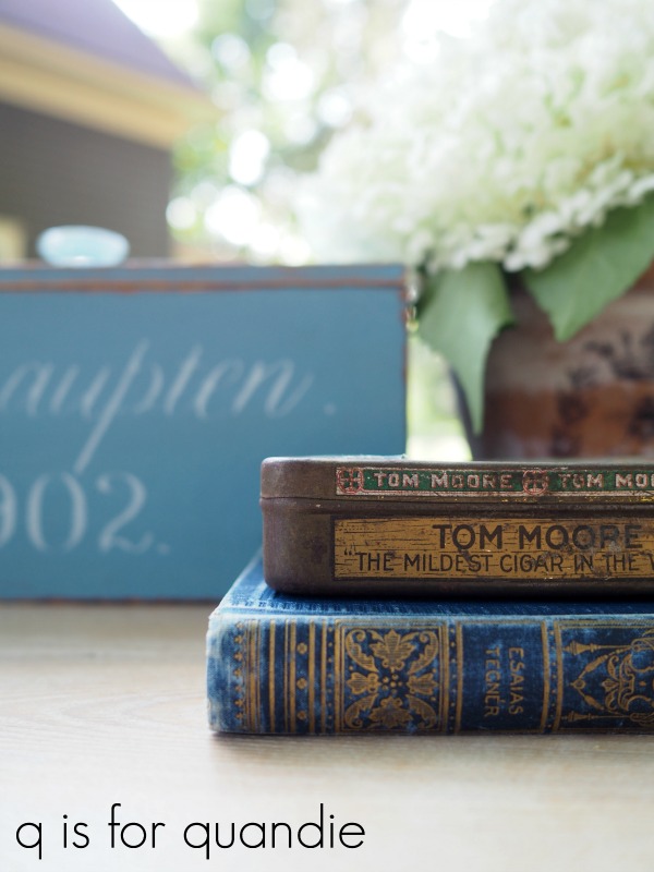 I took advantage of the light outside on a gorgeous summer evening and set up a little photo shoot with some Annabelle hydrangeas, an old book and this funky little cigar tin that my picker Sue also found for me.