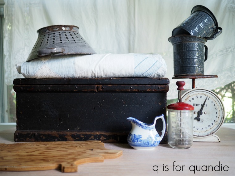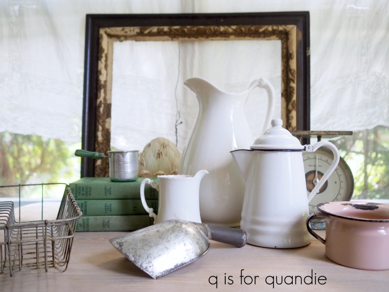 The flour bin, the black box, like you I have a few non collections too, and the scale in that order. Would that box fit on your bookshelves in the living room? Got to love the patina on everything. Isn’t it amazing how adding typography creates even more charm? The minute I saw the pink pot I thought chamberpot.