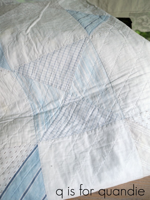 The 2nd thing was a very lovely pink and white hand sewn quilt. Unfortunately that was gone. However, I did find this pretty blue and white one which I didn’t even see on day 1.
