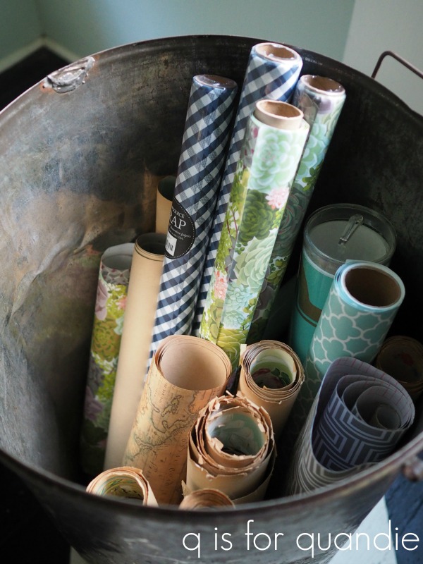 It’s a little hard to tell in that photo, but this thing is over 2′ tall. It would make an awesome trash can for the kitchen or bathroom, but I plan to use it to hold all of my rolls of paper and vintage wallpaper.