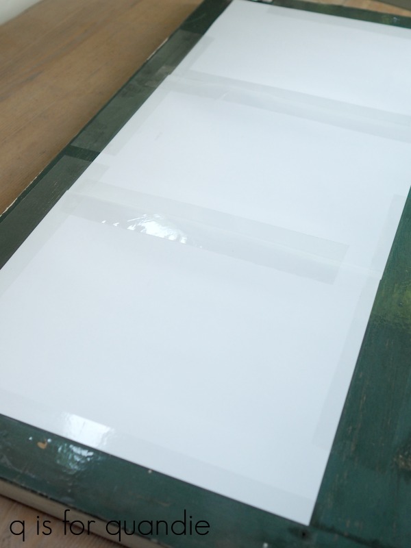 But then I realized that I liked the look of the photos with a little space between them and the glass.  So taping them to the back of the window frame without trimming them at all worked out perfectly well.