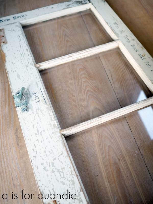 My neighbor, nnK, has a stash of old windows from a barn that was torn down.  I was over at her house one day because one my fellow vendors from Reclaiming Beautiful, Amy, was looking for old windows to build a green house (I can’t wait to see how that project turns out for her!)  Amy left with a truck load of windows, and afterwards I noticed that there was just one 3 pane window left in the stash and it had perfectly chippy white paint so nnK let me have it, sort of like a commission for finding her a buyer for the windows.