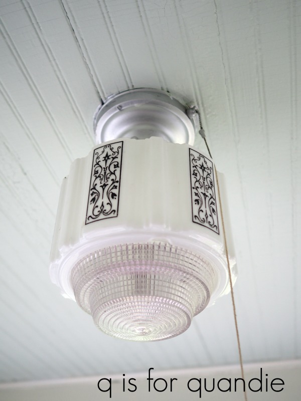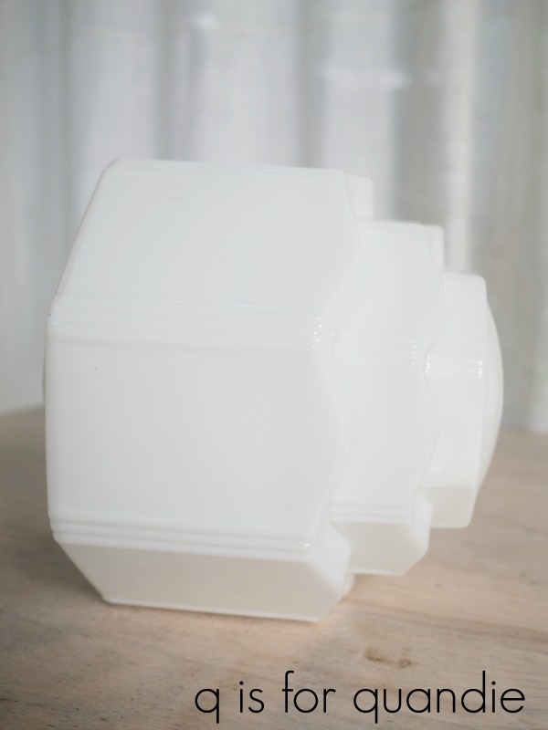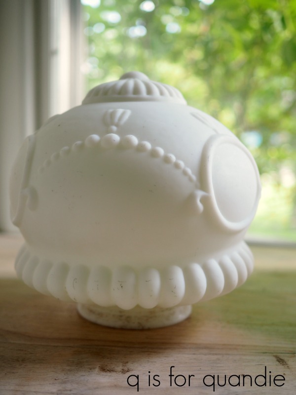 Isn’t that gorgeous? I paid $5 for it at an estate sale earlier this summer. I just couldn’t pass it up. I purchased it hoping it would fit the fixture in my guest room but unfortunately it didn’t. So if I want to use it, I’ll need to get a base that fits this size globe. I’m still considering that move.