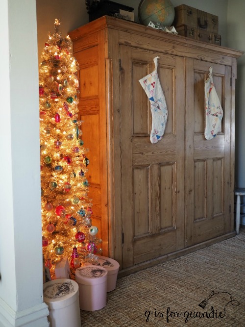 In the past I haven’t had a great spot for the tree, and I also didn’t have a lot of room for a large tree.  So I have a slender, silver tree and I placed it in the corner of the piano room (above), and I also tried tucking it beside the pine cupboard in the q branch one year.