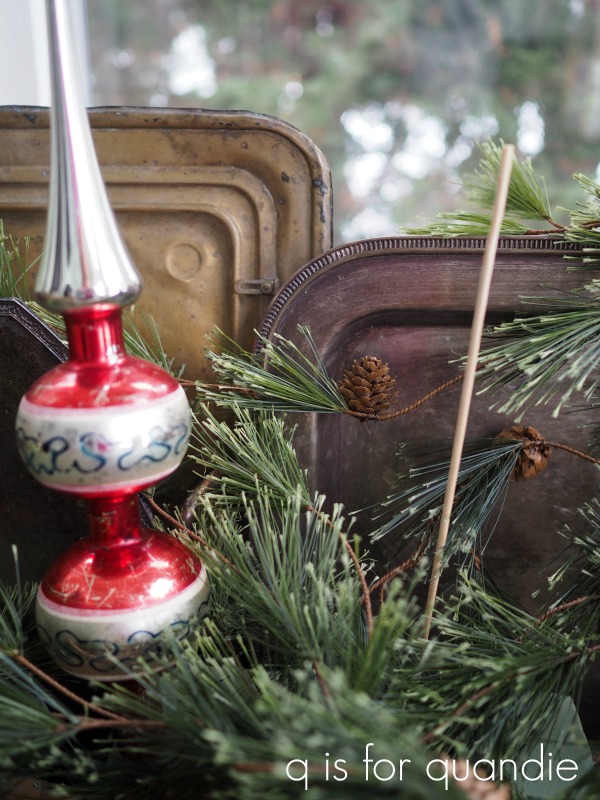 You’ve normally seen it in the past filled with my huge non-collection (I swear I’m not a collector, remember?) of vintage ornaments (and there are those toppers in the window too).