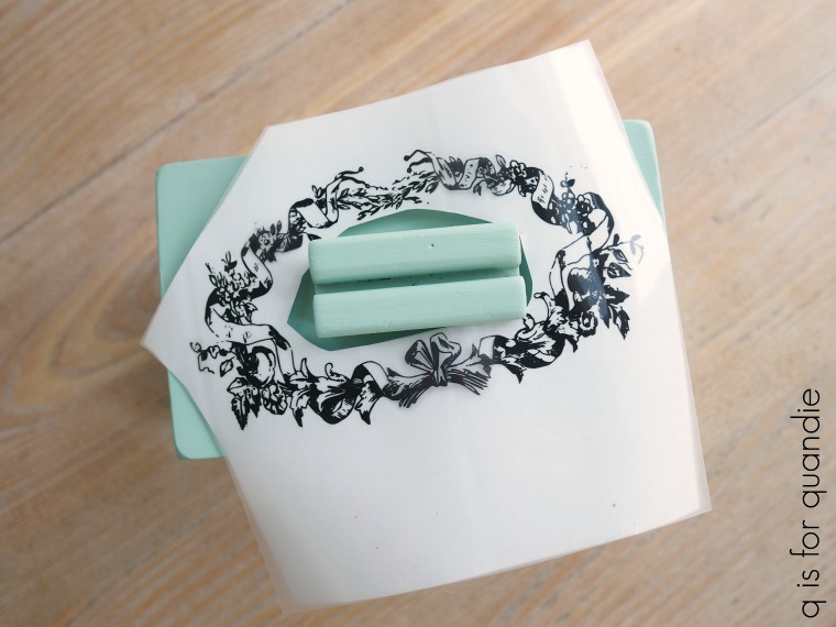 I started by painting it in Dixie Belle’s Sea Glass. Then I sanded the edges and added one of re.design with prima’s Classic Vintage Label transfers to the front.