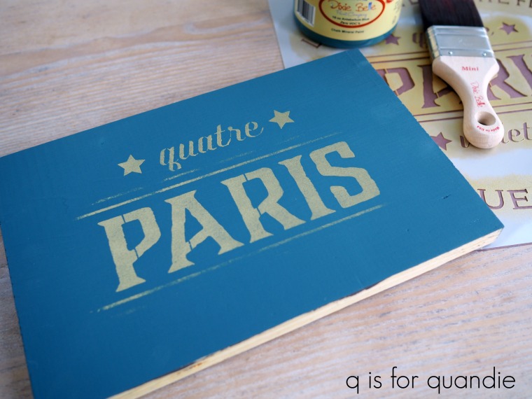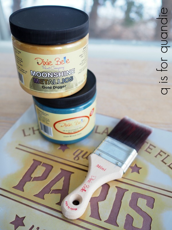 So I painted a piece of board in the Antebellum Blue, and then stenciled it using the Gold Digger.