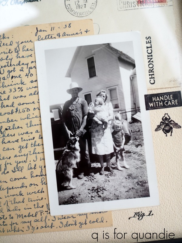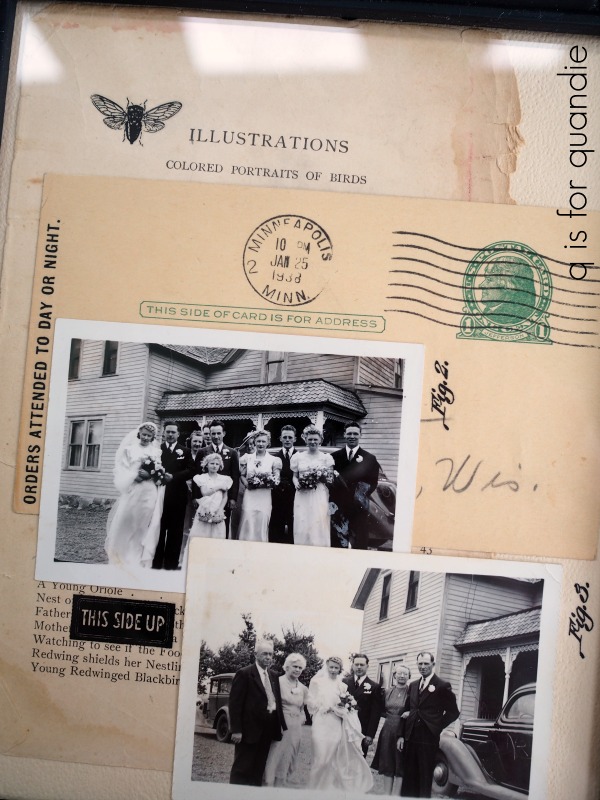 The old postcards I used are not family history, I purchased them at an estate sale. So I’m not defacing family heirlooms or anything. The photos are old family photos, but they are the ones where no one was able to identify the people in them when we went through them a few years back.