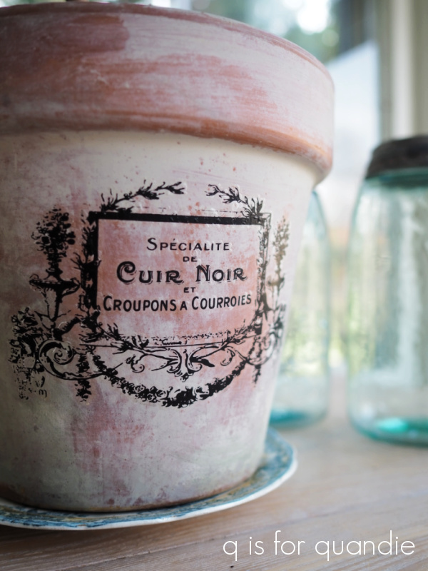I love that pot!  It’s perfectly aged, and quite beat up, but that’s what appeals to me.  I added the graphic using the transfer gel method and you can read more about that here.