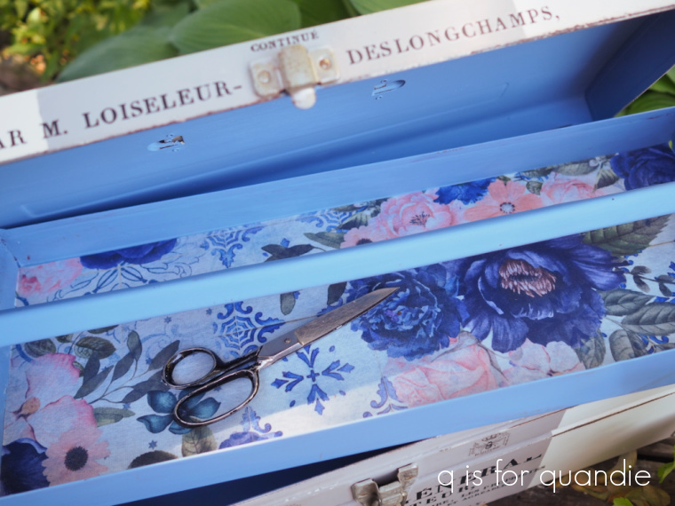 I lined it with re.design with prima’s Fancy Essence decoupage decor tissue paper, which worked beautifully with the Blueberry paint color.  This time I used Dixie Belle’s flat clear coat as a decoupage medium and it worked beautifully.  So if you like a flat finish, even over your decoupage, give it a try.