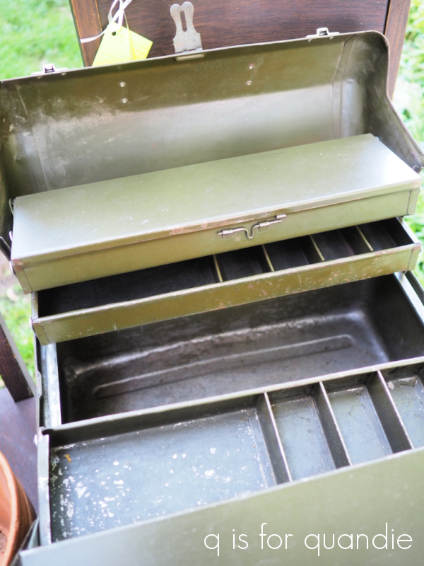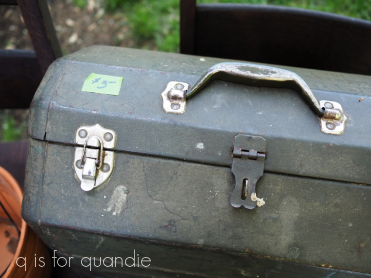 In keeping with my ‘sticker shock’ theme though, at the very same sale they had another vintage toolbox that I saw first and it was priced at $25.  Far too high for me.  But then I walked into the garage a bit further and found this one for $2.  Isn’t that odd?  Two vintage toolboxes at the same sale, one is $2 and the other $25.  What gives?  I even went back and checked again, yep, that first tag definitely said $25.  So then I opened up that toolbox to look for the gold ingots, but nope, it was empty.  Go figure.