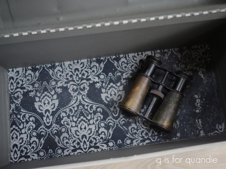 After painting the inside in the Gravel Road, I added a bit of re.design with prima’s Dark Damask decoupage décor tissue paper to the bottom.
