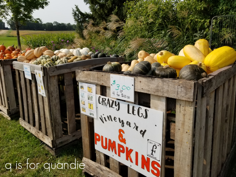 They also grow pumpkins and squash at Crazy Legs Vineyard, and they sell them at the end of their driveway.
