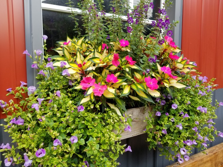 I tried Angelonia (tall purple one in the center) in my front window boxes once and they were a complete failure, but they look amazing here.  I’ve never had great luck with Torenia (low purple ones on the side) either.  And I love how they combined these with the variegated New Guinea Impatiens.  Really unique and pretty fabulous.