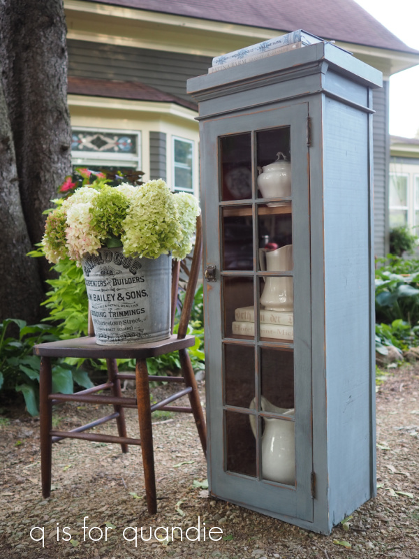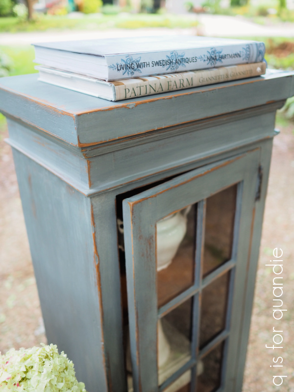 I love that smoky blue grey color, along with the really worn and distressed look of that cabinet.