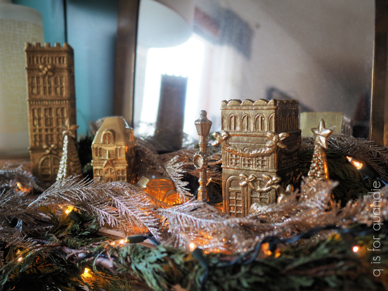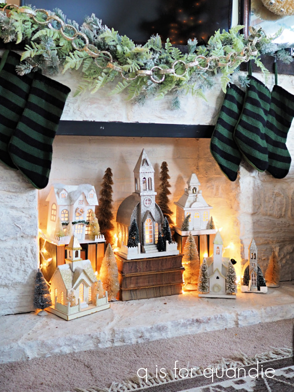 I’ve stolen her idea of using vintage books to add different levels for my own Christmas village, and it worked great here inside her fireplace as well.