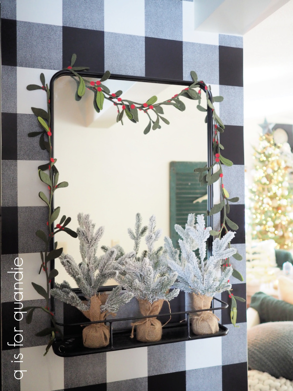 First up in Amy’s foyer is this narrow wall that she wallpapered in a buffalo check.  What a great spot for some wallpaper with a lot of impact, right?  And I love the simple way she’s decorated the mirror with a delicate garland and a trio of tiny flocked trees.