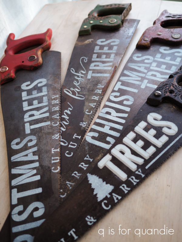 I had purchased a bunch of old handsaws at a garage sale back in 2017, so I dressed them up for Christmas with stencils.