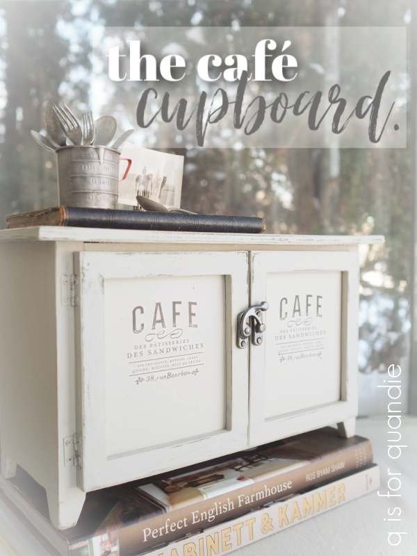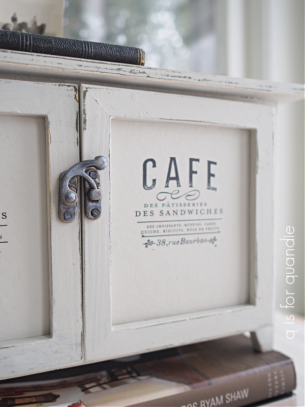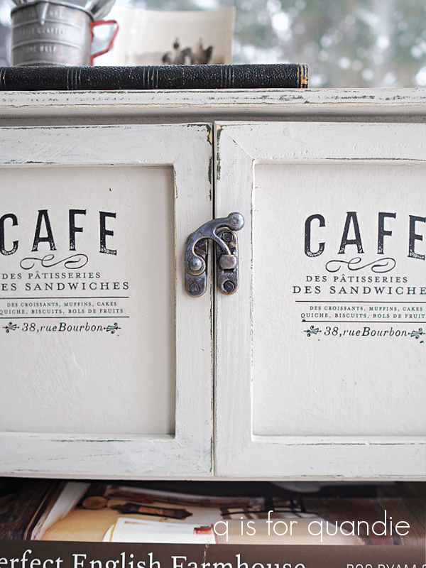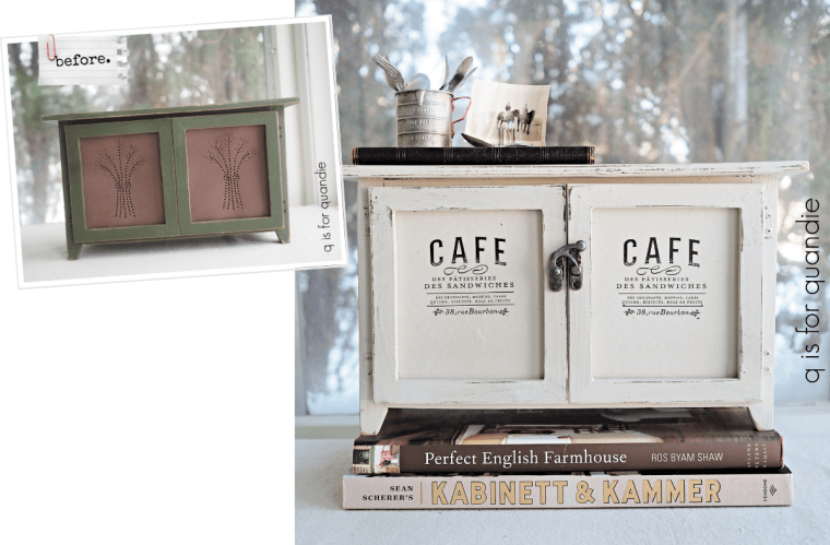 This was a fun little project to tackle on a cold January day. And really, any of the changes I made to this piece could apply to a larger piece of furniture too. Replace cupboard door inserts, add hardware, change the color of hardware with a gilding wax, add transfers, modify transfers by eliminating portions you don’t want to use, and of course paint.