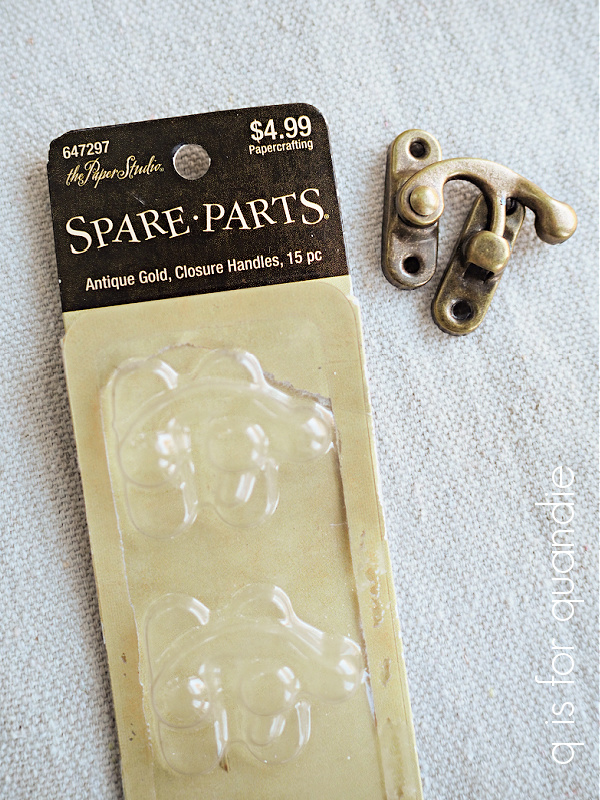 That’s not exactly meant to be ‘real’ hardware. It’s a scrapbooking do-dad, made out of very thin metal (Hobby Lobby carries the Paper Studio brand). The color it comes in originally is called ‘antique gold’.