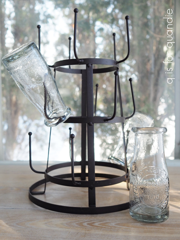 According to Eye For Design, “the purpose of the French bottle drying rack was to provide a place for French families to dry and store empty wine bottles before returning them to the vintner for refills.” How fabulous is that? I’ve seen anything from drinking glasses, coffee cups, clay pots, and spools of ribbon or thread as ideas for what to put on one of these.