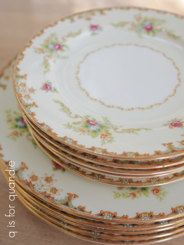 There was a little washboard, some old wooden clothespins, and a few pieces of ironstone inside that cardboard suitcase. I found the bunny mold and the pretty floral platter while out thrifting.