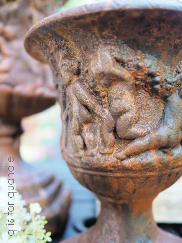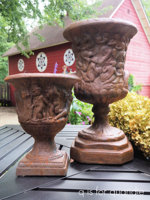 1. Cracking up at your comments on urn number 1. All of these look amazing in rust. I got some of the rust paint and I love the patina also. You are spot on with the cherubs. So much better in rust and I can picture them nestled in some greens for an amazing display inside or out.