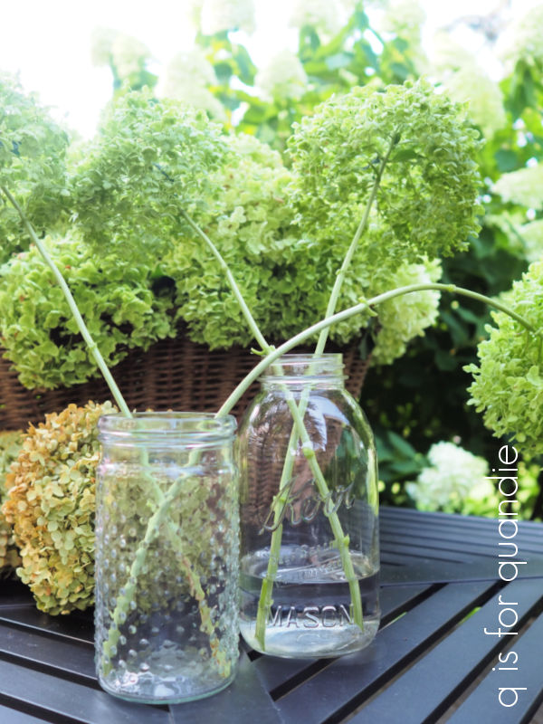 That timing is going to be different for different varieties of hydrangeas because of their bloom times. My Annabelle hydrangeas started blooming back at the end of June. Their flowers went from white, to green and are beginning to show a bit of brown here and there.