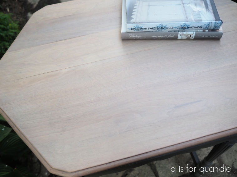 But this time I decided to go for a similar look using a different technique. Once again, I stripped off the original finish from the top of the table using CitriStrip. I used Klean Strip After Wash after the stripper to make sure I’d gotten all of the stripper residue off. Once that was dry, I sanded the top with 220 grit paper to smooth it out. Then I added just one coat of Varathane’s Sunbleached fast drying stain.