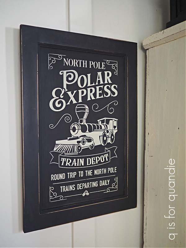 I’m planning to paint up a few more cupboard door signs for Christmas this year, like this one with the wallcutz Polar Express Train Depot stencil.