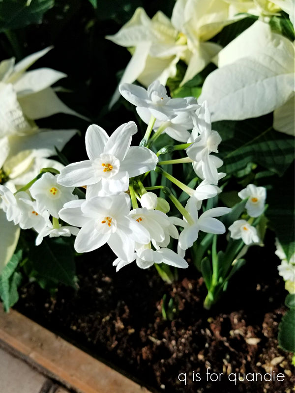 Of course there were lots of white poinsettias, plus other flowers that I think of as typical Christmas plants like paperwhites …