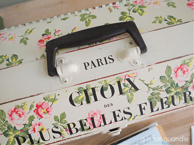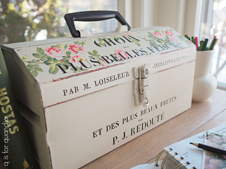 I sure am getting my use out of those Rose Chintz paint inlays.  Here are links to a few more projects I’ve used them on; a black toolbox, a tackle box, a green bench, another toolbox, some books, a watering can, and a green flower crate.