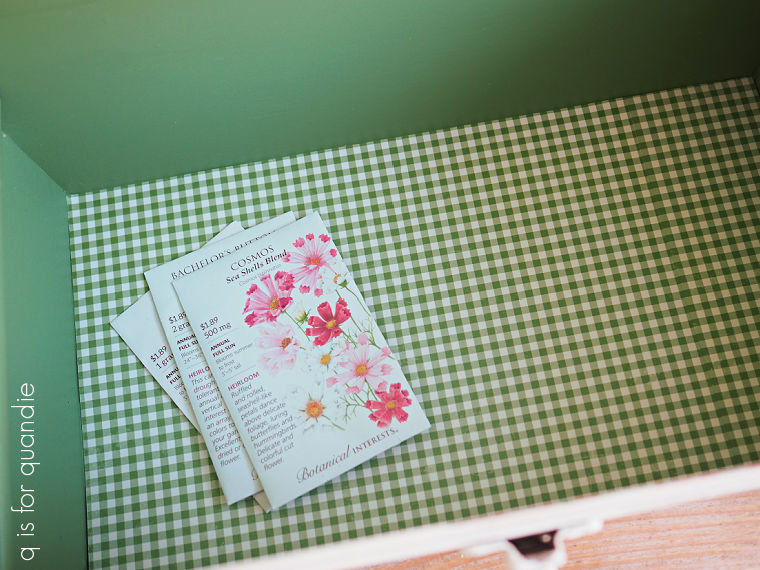 This one is nice and roomy at 15″ wide x 8″ deep x 8″ tall. You could keep all kinds of fun things inside. The paper is not adhered and thus could be easily removed if you want to use this toolbox for things like garden tools.