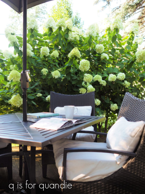 I like leaving a little more height on the hydrangea next to our deck because once it leafs out it creates a nice little privacy screen. It doesn’t look like much now, but here’s how it will look from this spot in August.