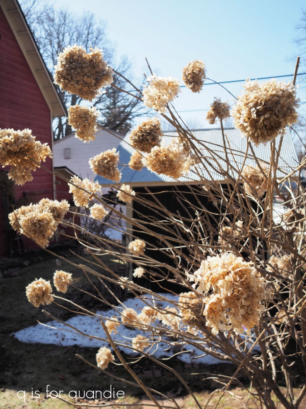 After a long, snowy winter the blooms that I left on for winter interest are looking pretty tired (and yes, that is still a big patch of snow and ice in front of the potting shed, will it ever melt?).