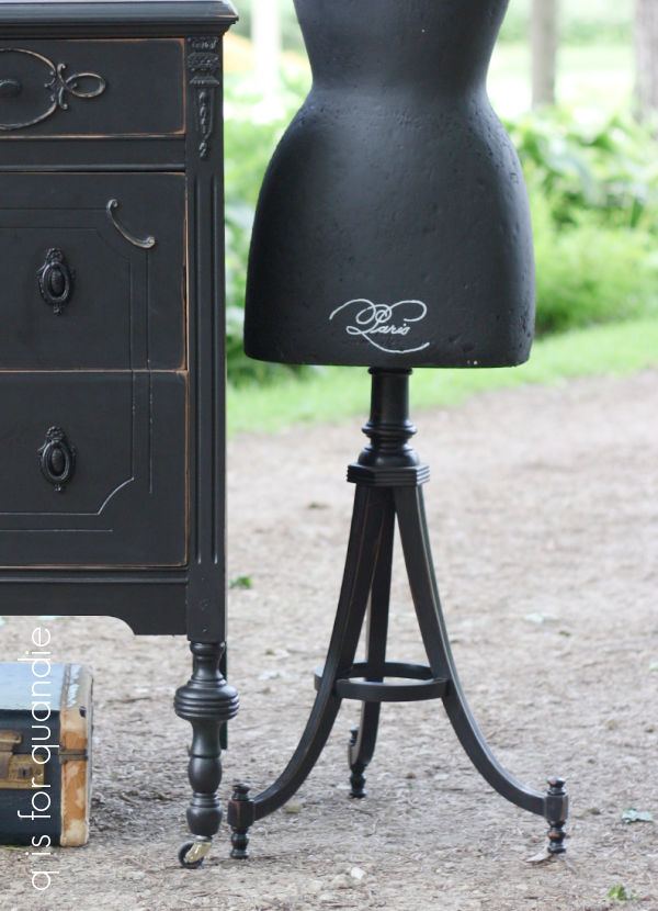 It was a long time ago, but I’m pretty sure I painted the table base in black latex paint.  I was totally unfamiliar with chalk paint back then.  However, I painted the Styrofoam torso in Rust-Oleum black chalkboard paint.