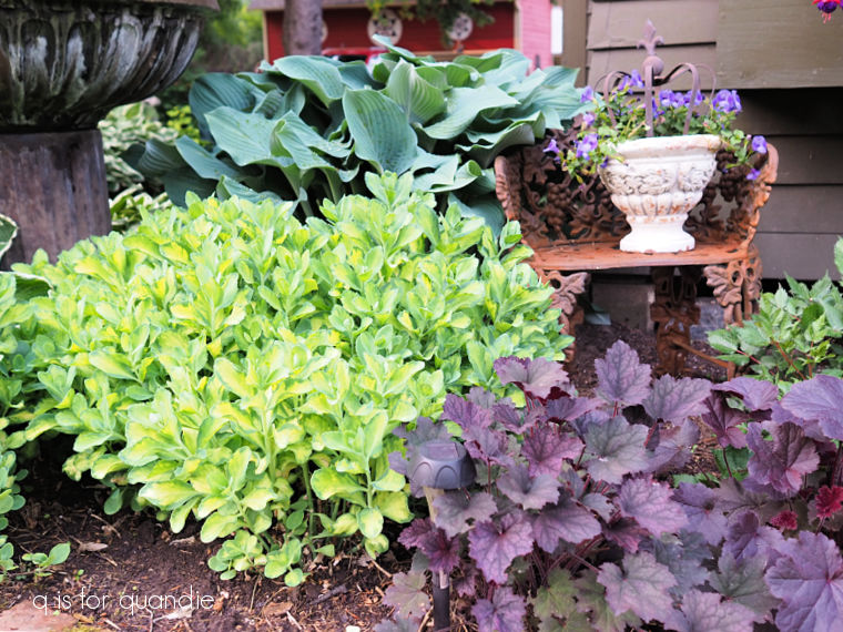 I have to say, before I discovered the Chelsea chop this variegated sedum was definitely not one of my favorite plants. It always tended to flop over and look pretty sloppy in the garden. Now that it stays a bit more compact, I really love the way it looks in combination with the ‘blue’ upright hosta behind it, and the purple heuchera beside it.