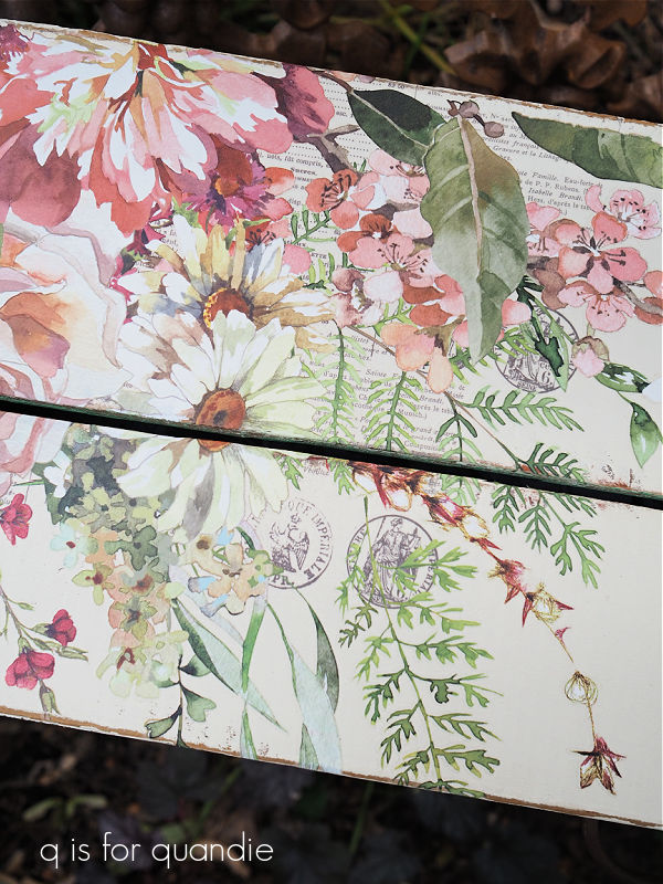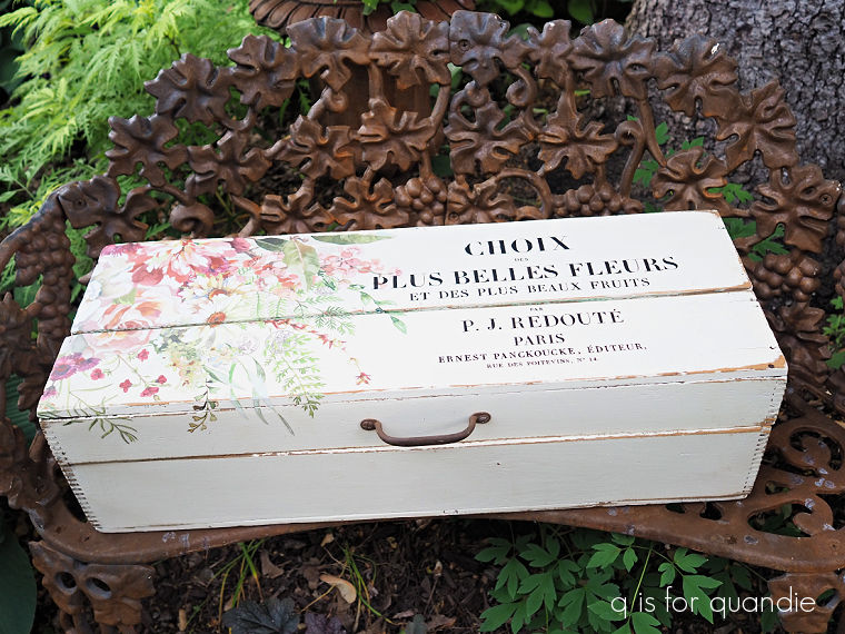 After painting the exterior of the box in Dixie Belle’s Drop Cloth and sanding it well to distress the edges, I added just one sheet of the Elysium transfer to the top (this transfer comes in 4 pieces).
