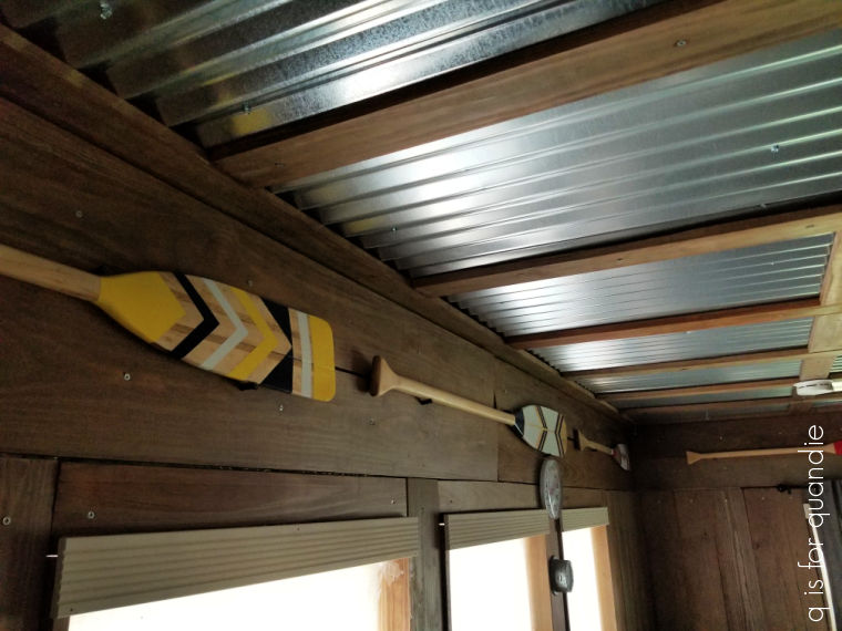 Karen displays a number of her paddles around the perimeter of her sun room (which happens to have really cool wood clad walls and a corrugated metal ceiling).